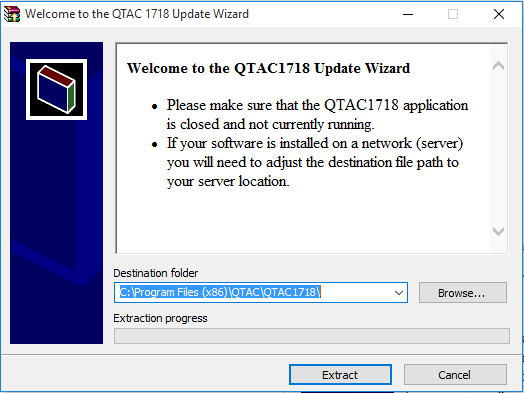 - The ‘Destination Folder’ path will point to default location for that years version of QTAC. If you have installed your software to a different location – or on to a server – then click on ‘Browse’ and navigate to that location.