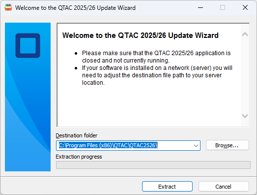 - The ‘Destination Folder’ path will point to default location for that years version of QTAC. If you have installed your software to a different location – or on to a server – then click on ‘Browse’ and navigate to that location.