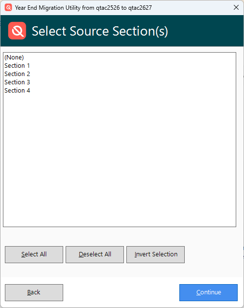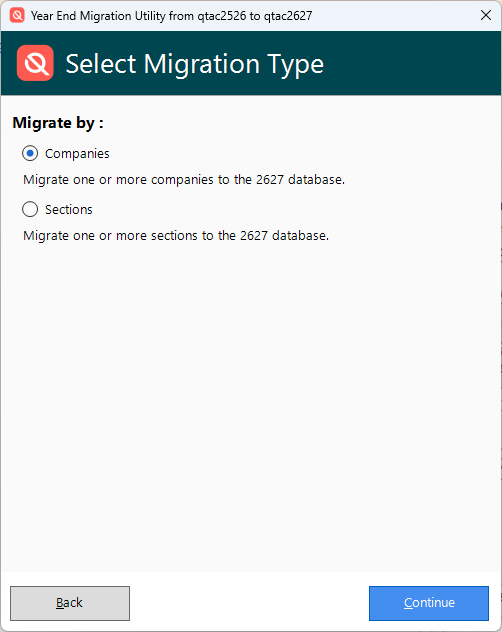 Once you have selected the sections you wish to migrate, pressing 'Continue' will then continue the migration process as normal, except you will now be migrating by section instead of by company.