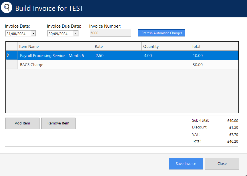 - The software will automatically populate a payroll processing service line item, with the quantity of employees processed for the period. The rate will be defined by the price list assigned.
