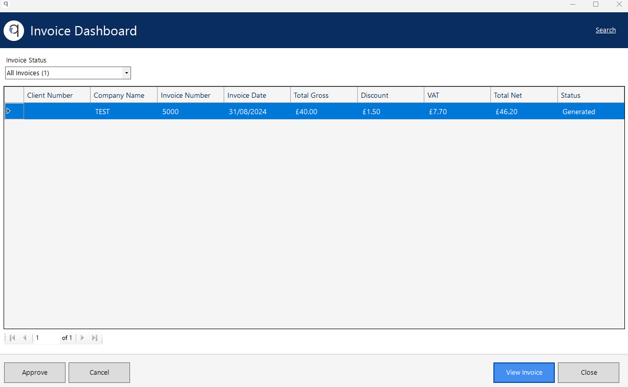 Qtac's invoice dashboard (Invoicing > Invoice Dashboard), provides a management overview of invoicing. Invoices can be filtered by their current status, or searched using the search function.